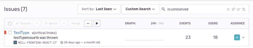 Let's first understand how errors and transactions group into an issue. In the example above, the issue testTypeIssue14 has 718 events that Sentry grouped into an issue because they share the same fingerprint.